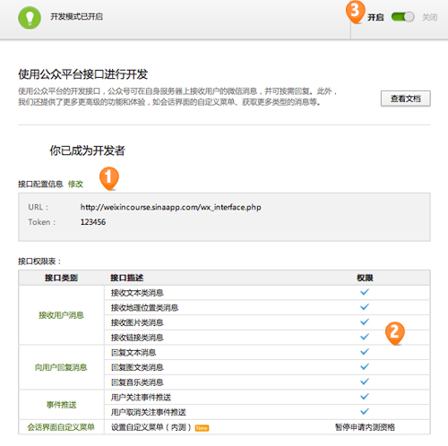 最重要的一步就是打开开发模式的开关,现在公众账号进入开发模式了!