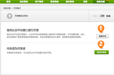 我们先回到微信公众平台上来,点击高级功能进入,选择开发模式进入开发模式的页面,使用开发模式前记得先把编辑模式关闭,如下图: