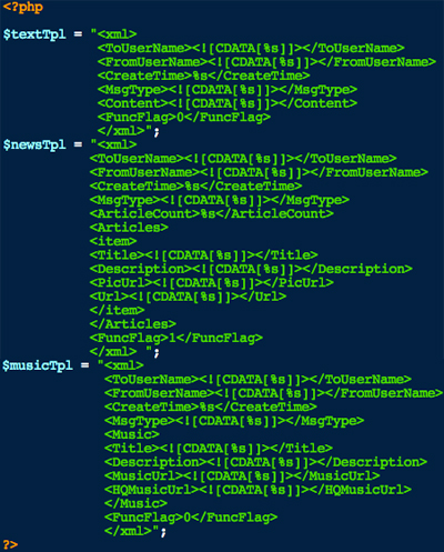 前面接口对接成功后,公众账号无法再与用户互动了,那么我们先把订阅欢迎这个功能恢复吧,回到SAE平台上,在编辑平台新建一个文件,我们把它命名为“wx_tpl.php”,这个文件的目的是存放微信输出内容的模板,细心的朋友会发现这就是目前接口可以给用户回复的三种消息格式,分别是文本、图文、音乐。内容如图: