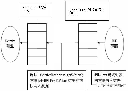 JSP页面中的out对象的类型为JspWriter,JspWriter相当于一种带缓存功能的PrintWriter,设置JSP页面的page指令的buffer属性可以调整它的缓存大小,甚至关闭它的缓存。