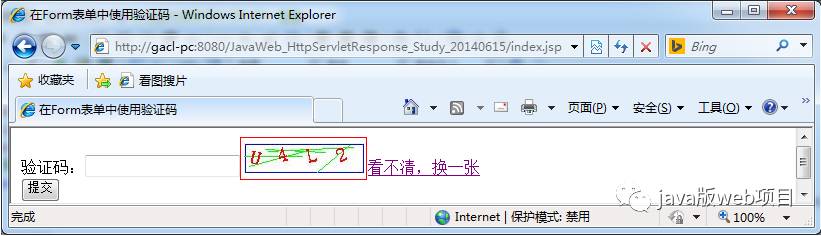 1 <%@ page language="java" import="java.util.*" pageEncoding="UTF-8"%> 2 <!DOCTYPE HTML PUBLIC "-//W3C//DTD HTML 4.01 Transitional//EN"> 3 <html> 4 <head> 5 <title>在Form表单中使用验证码</title> 6 <script type="text/javascript"> 7 //刷新验证码 8 function changeImg(){ 9 document.getElementById("validateCodeImg").src="${pageContext.request.contextPath}/servlet/DrawImage?"+Math.random();10 }11 </script>12 </head>13 14 <body>15 <form action="${pageContext.request.contextPath}/servlet/CheckServlet" method="post">16 验证码:<input type="text" name="validateCode"/>17 <img alt="验证码看不清,换一张" src="${pageContext.request.contextPath}/servlet/DrawImage" id="validateCodeImg" onclick="changeImg()">18 <a href="javascript:void(0)" onclick="changeImg()">看不清,换一张</a>19 <br/>20 <input type="submit" value="提交">21 </form>22 </body>23 </html>