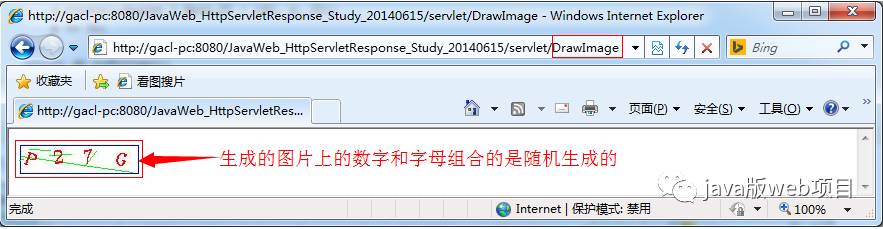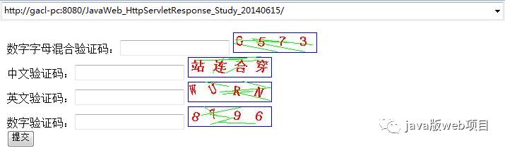 DrawImage Servlet除了可以生成的字母和数字的组合的验证码图片之外,还可以生成汉字,纯数字,纯字母的验证码图片,只需要向DrawImage Servlet传递约定好的生成标识符参数即可,如下所示: