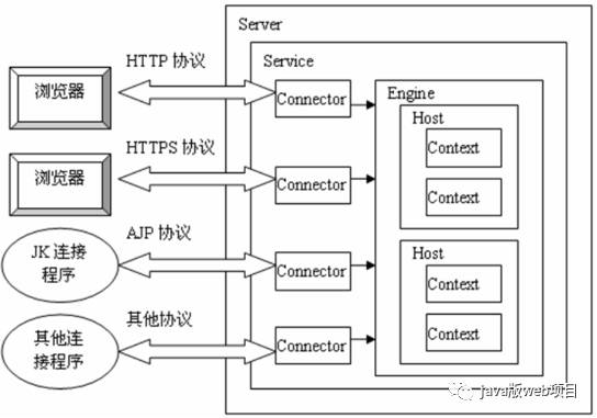 Tomcat服务器的启动是基于一个server.xml文件的,Tomcat启动的时候首先会启动一个Server,Server里面就会启动Service,Service里面就会启动多个"Connector(连接器)",每一个连接器都在等待客户机的连接,当有用户使用浏览器去访问服务器上面的web资源时,首先是连接到Connector(连接器),Connector(连接器)是不处理用户的请求的,而是将用户的请求交给一个Engine(引擎)去处理,Engine(引擎)接收到请求后就会解析用户想要访问的Host,然后将请求交给相应的Host,Host收到请求后就会解析出用户想要访问这个Host下面的哪一个Web应用,一个web应用对应一个Context。