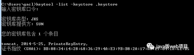 使用命令:keytool -list -keystore .keystore查看.keystore密钥库里面的所有证书