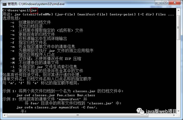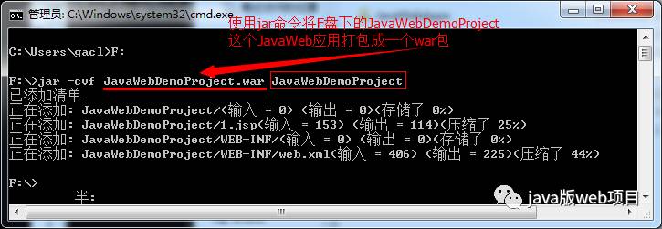 在Java中,使用"jar"命令来对将JavaWeb应用打包成一个War包,jar命令的用法如下: