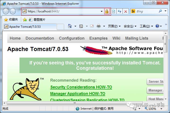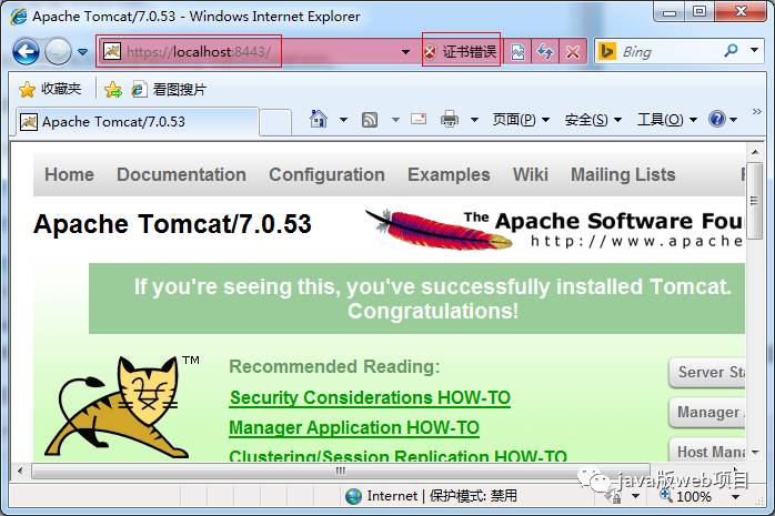 证书安装成功后,重启IE浏览器,使用"https://localhost:8443/"访问8443的加密连接器,此时浏览器就不再提示证书错误了,如下图所示: