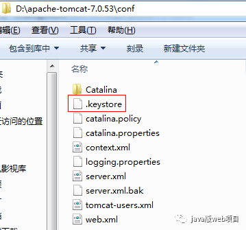 将生成的.keystore密钥库文件拷贝到Tomcat服务器的conf目录下,如下图所示: