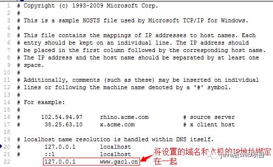 编辑这个文件,将新添加的网站的域名和IP地址绑定在一起,这样我们就可以在浏览器中使用www.gacl.cn这个域名去访问name是www.gacl.cn那个虚拟主机里面管理的那些web应用了