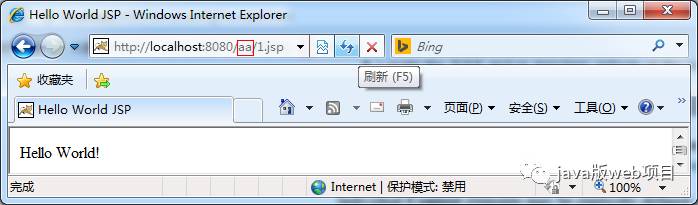1.jsp可以正常访问,这说明我们已经成功地将将在F盘下的JavaWebDemoProject这个JavaWeb应用映射到JavaWebApp这个虚拟目录上了,访问"/JavaWebApp/1.jsp"就相当于访问"F:JavaWebDemoProject1.jsp"