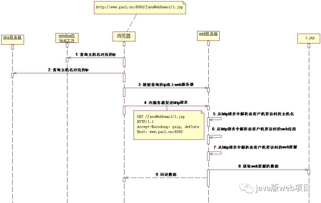 当我们打开浏览器,在浏览器的地址栏中输入URL地址"http://www.gacl.cn:8080/JavaWebDemo1/1.jsp"去访问服务器上的1.jsp这个web资源的过程中,浏览器和服务器都做了神马操作呢,我们是怎么在浏览器里面看到1.jsp这个web资源里面的内容的呢?