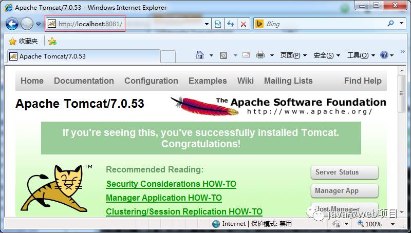 访问Tomcat服务器也必须以新的访问端口去访问:http://localhost:8081/,如下图所示: