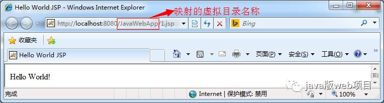 使用浏览器访问"/JavaWebApp"这个虚拟目录下的1.jsp这个web资源,访问结果如下: