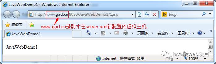 使用浏览器通过域名"www.gacl.cn"访问"www.gacl.cn"这个虚拟主机下的JavaWebDemo1这个web应用下的1.jsp这个web资源,"www.gacl.cn"这个虚拟主机开放了一个8080端口,用户只能通过这个8080端口去访问JavaWebDemo1这个web应用下的1.jsp这个web资源