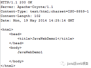 1 HTTP/1.1 200 OK 2 Server: Apache-Coyote/1.1 3 Content-Type: text/html;charset=ISO-8859-1 4 Content-Length: 102 5 Date: Mon, 19 May 2014 14:25:14 GMT 6 7 <html> 8 <head> 9 <title>JavaWebDemo1</title>10 </head>11 <body>12 JavaWebDemo113 14 </body>15 </html>