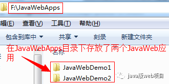 例如:把F盘下的JavaWebDemoProject这个JavaWeb应用直接copy到tomcat服务器webapps目录中,如下图所示: