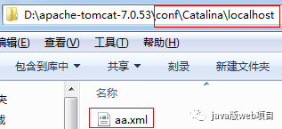 意思就是:在tomcat服务器的confCatalinalocalhost目录下添加一个以xml作为扩展名的文件,xml文件的名字可以任意取,比如下面的aa.xml,注意这一句话"The context path and version will be derived from the base name of the file",这一句话的意思翻译过来就是"context元素的path属性源自于是这个xml文件的名字",上面提到过,Context元素的path属性是用来配置虚似目录的名称的,所以虚似目录的名称就是这个xml文件的名称。