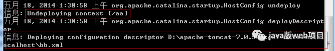 使用这种方式映射虚拟目录的最大好处是修改了配置文件后不用重启Tomcat服务器,比如将aa.xml修改成bb.xml,Tomcat服务器会自动Undeploying context [/aa],然后自动信息: Deploying configuration descriptor D:apache-tomcat-7.0.53confCatalinalocalhostb.xml