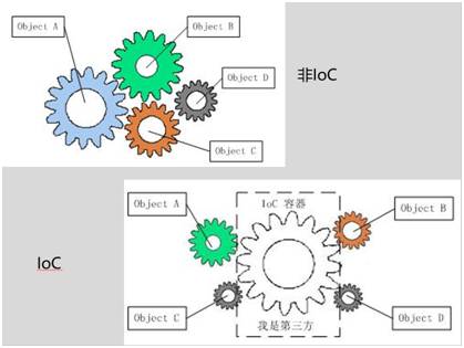 即利用第三方容器来管理类之间的耦合。在Spring中,对应的概念是Spring容器。它的设计思想主要是是反转资源获取的方向。