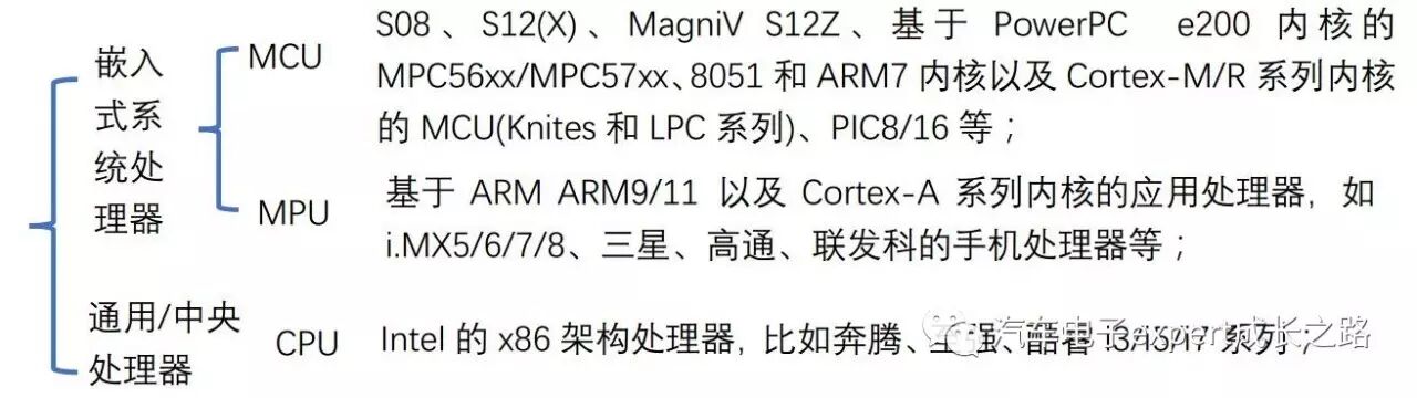 嵌入式系统中的处理器按照是否集成片上Flash和RAM可以分为MCU(MicroControl Unit—微控制器)和MPU(MicroProcess Unit—微处理器)。典型的MCU如Freescale S08、S12和MPC56xx以及8051单片机等,而典型的MPU如基于ARMCortex A系列内核的i.MX系列处理器。