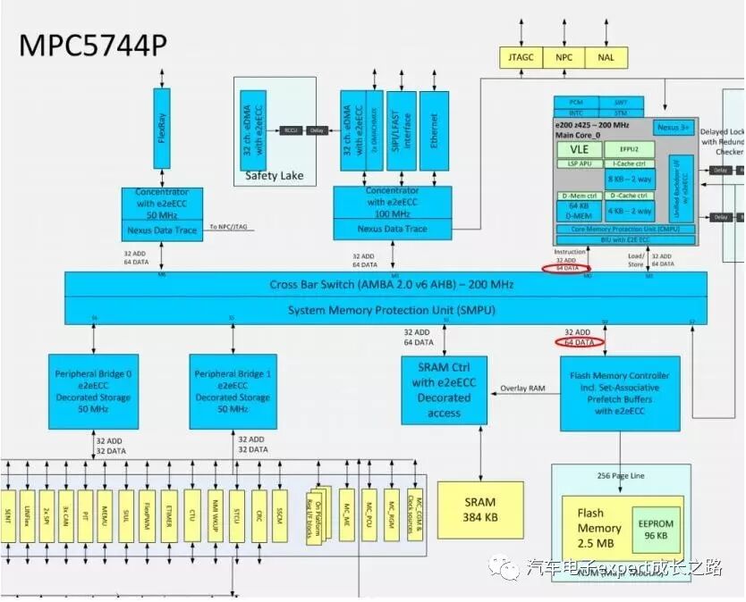 以下为NXP MPC5744P的内部Cross Bar总线互联框图,其指令和数据总线均为64位宽: