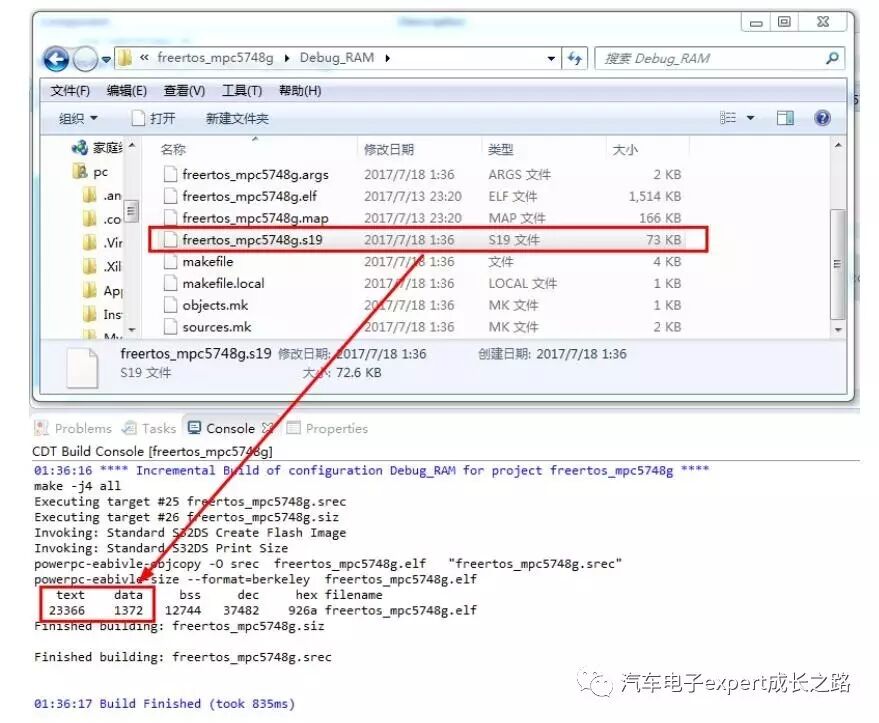 或者以IDE(比如CodeWarrior 10.6或者S32DS)的Print Size工具从控制台(console)打印出来的text + data来判断,下面是一个具体的MPC5748G S32DSfor Power V1.2工程,其编译及我国所占Flash的大小为23366(text) + 1372(data)=24738 Byte,而其S19文件大小为73KB。
