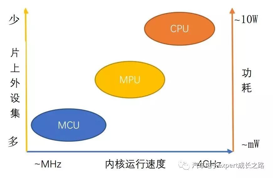 按照内核的运行速度和片上集成外设资源的丰富程度以及功耗,MCU、MPU和CPU的对比分布如下: