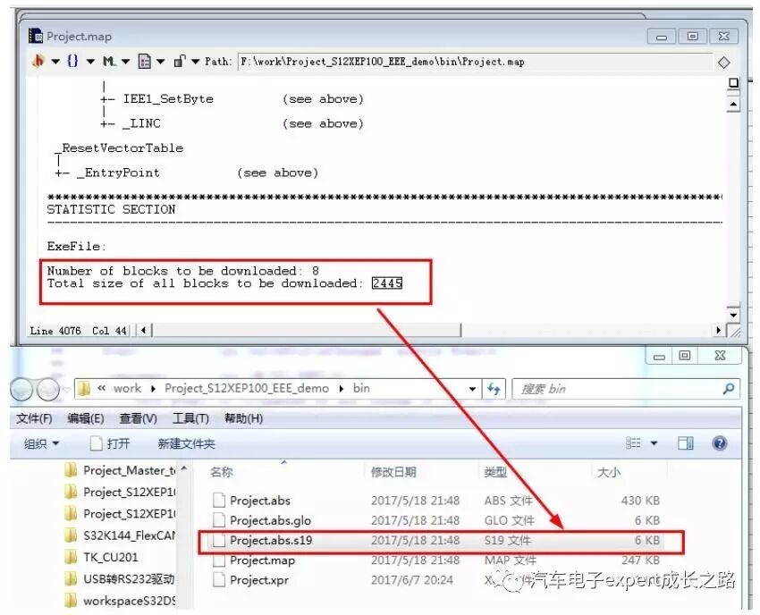 一个具体的S12XEP100的CodeWarrior5.2工程编译后S19文件的大小为6KB,而实际占用Flash的大小只有2445个字节,远小于S19文件的大小,所以判断一个应用工程编译结果所占Flash和RAM的大小,应该看MAP文件中的统计结果,而非S19文件的大小: