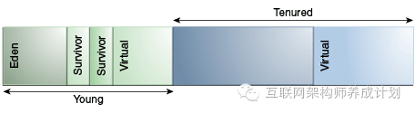 在初始化的时候,一个最大的地址空间被保留,但是仅在需要的时候才会分配物理地址。整个内存地址空间被划分为年轻代和成熟代。