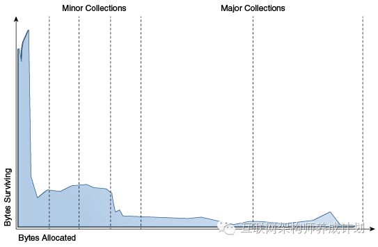 为了优化上图的场景,内存被分代管理(内存池里持有的对象按照不同的时期划分)。gc在每一个代被填满的时候发生,并且发生在每个代内。大多数的对象被分配在一个为年轻对象准备的内存池里(年轻代),并且大部分的对象也死在这里。当年轻代被占满的时候,会触发minor gc,minor gc仅回收年轻代的内存,不回收其他代的内存。基于弱代假设的前提:大部分在年轻代的对象是垃圾,并且可以被回收,minor gc是有优化的余地的。Minor gc的开销和年轻代存活的对象数量成正比,如果年轻代的对象全是死对象,那么回收起来是很快的。一般情况下,某些在年轻代存活的对象,在minor gc后,将被从年轻代移动到成熟代。最终,成熟代也会被占满,需要回收,导致发生major gc,在major gc中,整个堆将被回收。Major gc比minor gc持续的时间要长很多,因为major gc涉及到全局所有的对象。