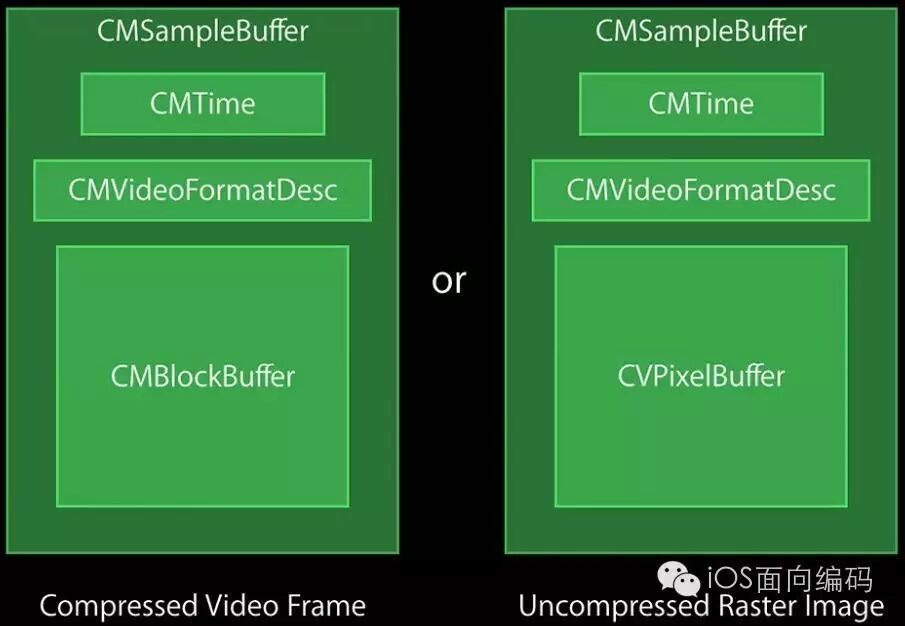 参数sampleBuffer为已编码的视频图像数据结构。CMSampleBufferRef是一个容易让人误解的数据结构,它可以包含已压缩数据(CMBlockBuffer)或未压缩数据(CVPixelBuffer)及相关描述信息,如下图所示。