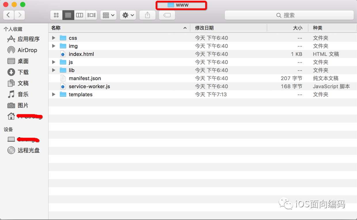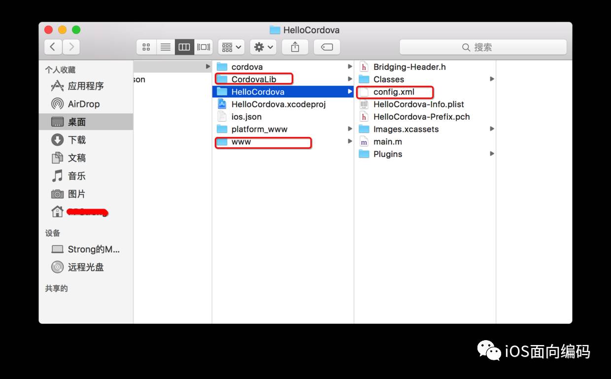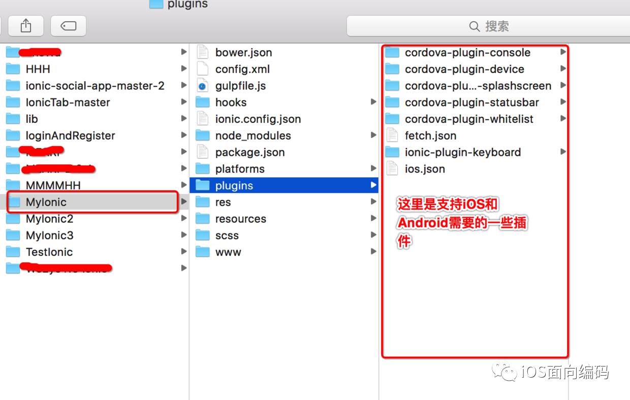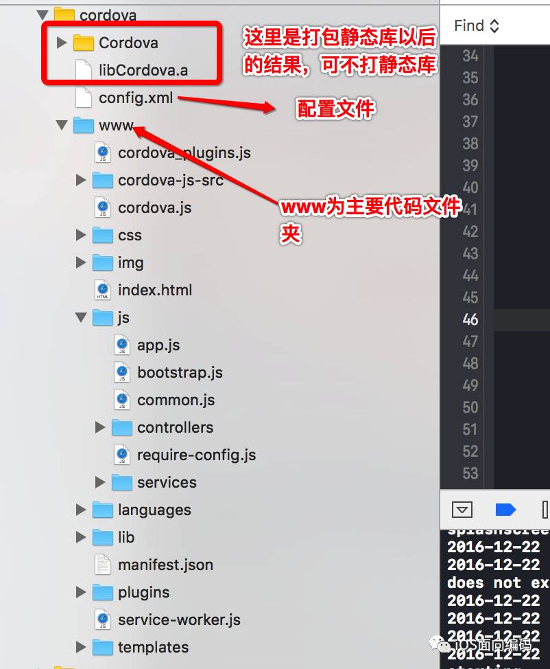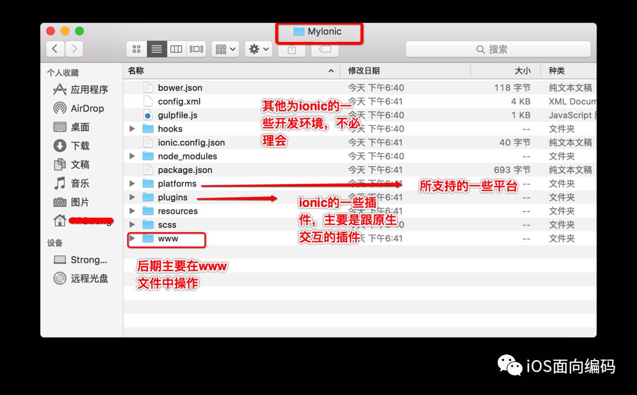 下面说下怎样将做 混合开发 以iOS为例,在原有原生的基础上,怎样将你的ionic代码放到你的项目中,将圈住的文件放到iOS项目中: