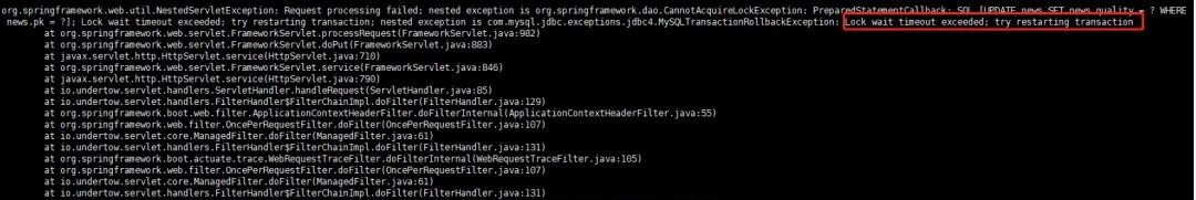 org.springframework.web.util.NestedServletException: Request processing failed; nested exception is org.springframework.dao.CannotAcquireLockException: PreparedStatementCallback; SQL [UPDATE news SET news.quality = ? WHERE news.pk = ?]; Lock wait timeout exceeded; try restarting transaction; nested exception is com.mysql.jdbc.exceptions.jdbc4.MySQLTransactionRollbackException: Lock wait timeout exceeded; try restarting transaction