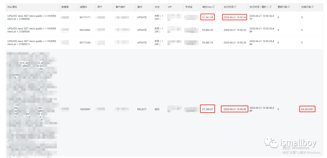 上图的第一行,就是报错接口业务层执行的更新语句,说明接口在更新mysql的时候,等待了51s,还没竞争到锁,所以失败了。但是那个慢查询是select类型的语句,根据mysql的mvvc乐观锁,不应该锁表才对啊,于是猜测可能是同一个事物里面,包含了update的语句以及该慢查询。这个事务先是update news表,这时候锁住相关记录,然后再执行这个慢查询,等慢查询结束之后,才释放锁,那就说明确实是这个慢查询的长事务导致的。于是根据这个sql的来源ip,原来是大数据团队的sql,通过大数据团队的确认,确实是猜想的那样,有个长事务,在同一个事务里面,先是update了news表,然后执行了上面的慢查询。于是让大数据团队赶紧优化sql,优化sql之后,持续跟踪了一段时间,发现这个问题不在出现。