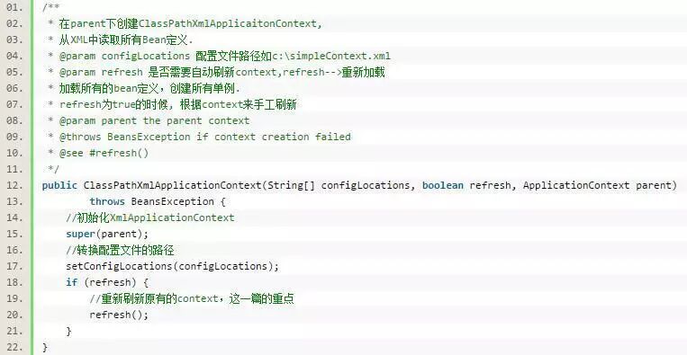 当运行ApplicationContext ctx = new ClassPathXmlApplicationContext("applicationContext.xml"); 构造方法ClassPathXmlApplicationContext(String configLocation)调用了this(new String[] {configLocation}, true, null);, 该构造方法具体代码如下。