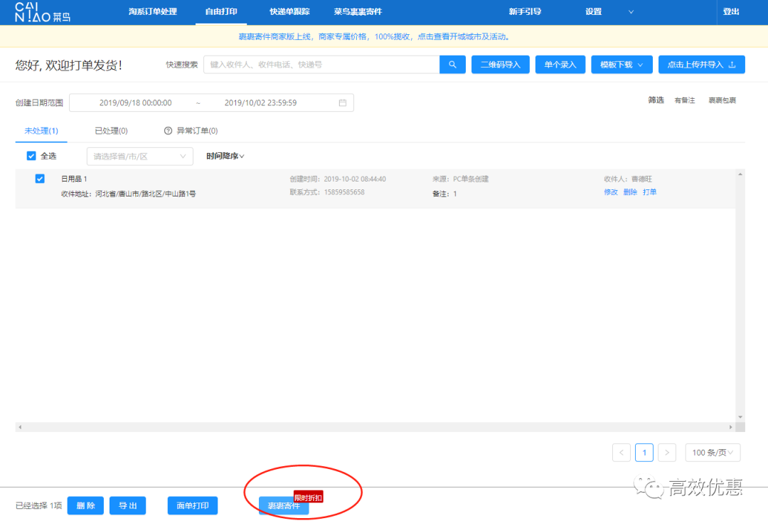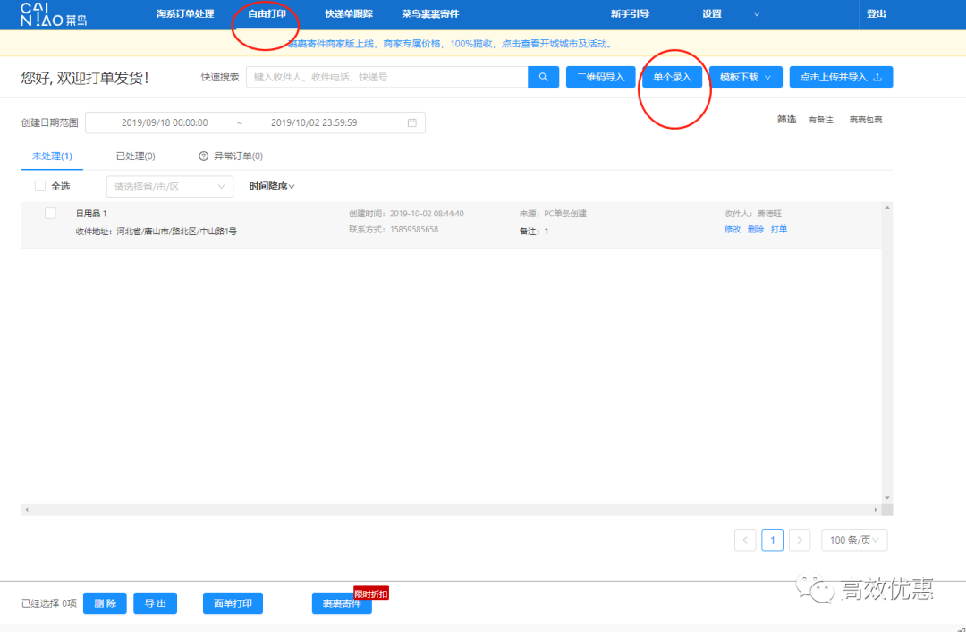 1.使用淘宝账号登录平台,https://fahuo.cainiao.com。2.点击自由打印、录入地址。