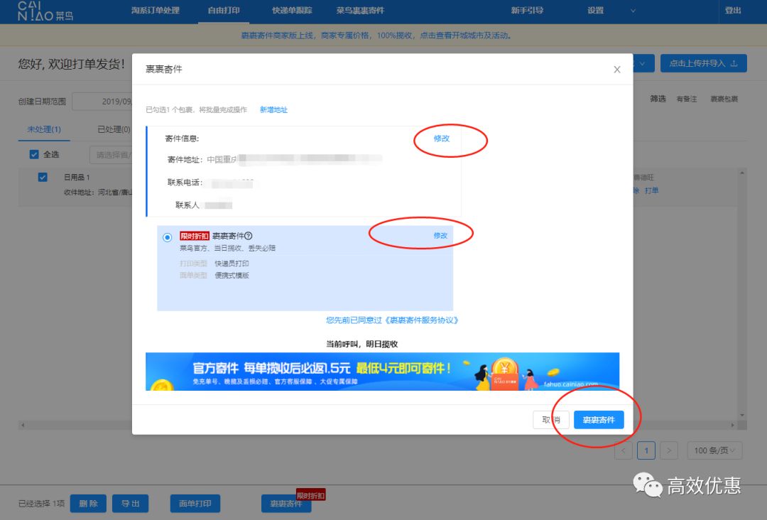 3.选定地址,点击下方菜鸟寄件。第一次要授权代扣。