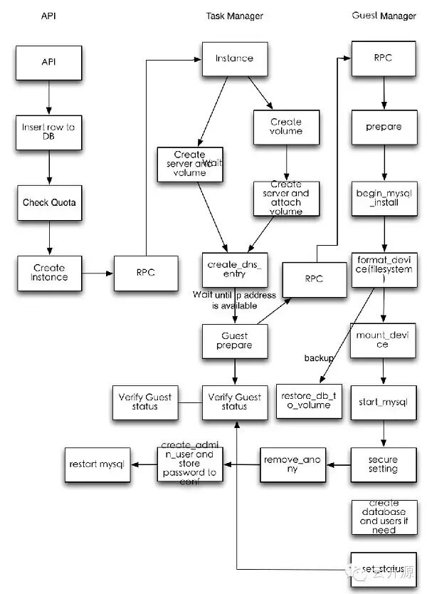 Trove主要逻辑目前Trove支持用户创建一个数据库服务实例,在实例里可以创建多个数据库并进行管理。数据库服务实例目前通过Nova API来创建,然后同样通过Nova API创建一个Volume(未来通过Cinder API)作为存储,然后在Nova Instance里加载预定义的带有MySQL的Image来启动MySQL。此时用户在得到一个创建好的数据库服务实例以后可以通过API创建数据库并 且指定参数,Trove通过在数据库服务实例里的guest agent来完成相应的命令。下图是Trove处理请求的最主要流程。图1 Trove处理请求的主要流程
