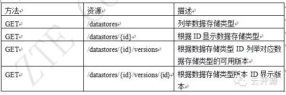 API规范用户可以列出数据存储管理程序的类型和可用的版本 Datastore types list (New call)请求消息结构tGET /{tenant_id}/datastores应答消息结构{ "id": "73144fc8-f2c5-4490-a2d7-76604c4528dd", "links": [... ], "name": "MongoDB"}{ "id": "e60153d4-8ac4-414a-ad58-fe2e0035704a", "links": [... ], "name": "Mysql"} Show datastore type (New call)请求消息结构tGET /{tenant_id}/datastores/e60153d4-8ac4-414a-ad58-fe2e0035704a应答消息结构{ "id": "e60153d4-8ac4-414a-ad58-fe2e0035704a", "links": [... ], "name": "Mysql"} Datastore type versions list (New call)请求消息结构tGET /{tenant_id}/datastores/e60153d4-8ac4-414a-ad58-fe2e0035704a/versions应答消息结构{ "id": "7d109ae8-d38f-41c8-86e4-a8e613f81be5", "links": [... ], "name": "ubuntu percona-5.5.33"}{ "id": "8ae342fb-19ac-4882-8978-fe1afb38c7c7", "links": [... ], "name": "fedora oracle-5.1.71"}{ "id": "94ed1f9f-6c1a-4d6e-87e9-04ecff37b64b", "links": [... ], "name": "ubuntu maria-10.0.4"} Show version (New call)请求消息结构GET /{tenant_id}/datastores/versions/7d109ae8-d38f-41c8-86e4-a8e613f81be5应答消息结构{ "id": "7d109ae8-d38f-41c8-86e4-a8e613f81be5", "links": [... ], "name": "ubuntu percona-5.5.33"} Create instance with specified datastore type and version (Existing call)请求消息结构POST /instances{"instance" : { "flavorRef" : "2", "name" : "as", "datastore": { "type" : "e60153d4-8ac4-414a-ad58-fe2e0035704a", "version" : "94ed1f9f-6c1a-4d6e-87e9-04ecff37b64b" }, "volume" : { "size" : "1" } }}应答消息结构{ "created": "2013-10-09T10:56:56", "flavor": { "id": "2", "links": [... ] }, "id": "86bb7492-d797-4562-b864-851c8fad7216", "links": [... ], "name": "as", "datastore": { "type": "Mysql", "version": "ubuntu maria-10.0.4" }, "status": "BUILD", "updated": "2013-10-09T10:56:56", "volume": { "size": 1 }} List instances (Existing call)请求消息结构tGET /instances应答消息结构{ "flavor": { "id": "2", "links": [... ] }, "id": "b1f0dff8-6303-4711-9d23-e899abc5d24d", "links": [... ], "name": "as_2", "datastore": { "type": "Mysql" }, "status": "ACTIVE", "volume": { "size": 1 }}{ "flavor": { "id": "2", "links": [... ] }, "id": "be1f10ae-afa9-4f75-808d-f7782784f363", "links": [... ], "name": "as_2", "datastore": { "type": "Mysql" }, "status": "ACTIVE", "volume": { "size": 1 }} l Get instance (Existing call)