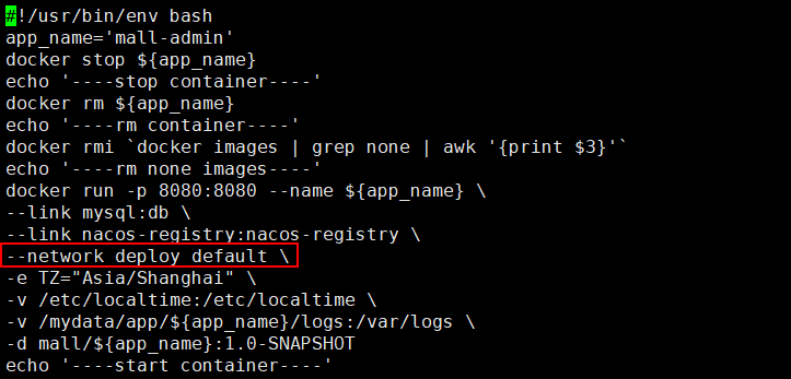 sh脚本,修改服务运行的网络,添加一行--network deploy_default即可。