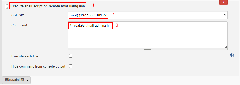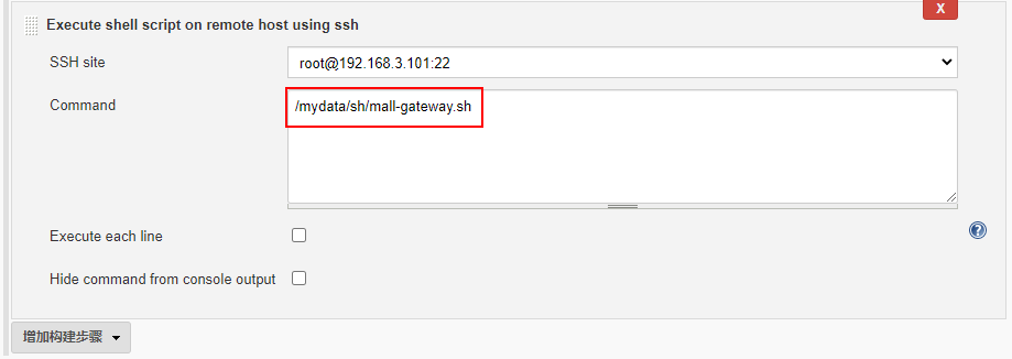 - 修改第三个构建中的SSH执行脚本文件位置,改为: