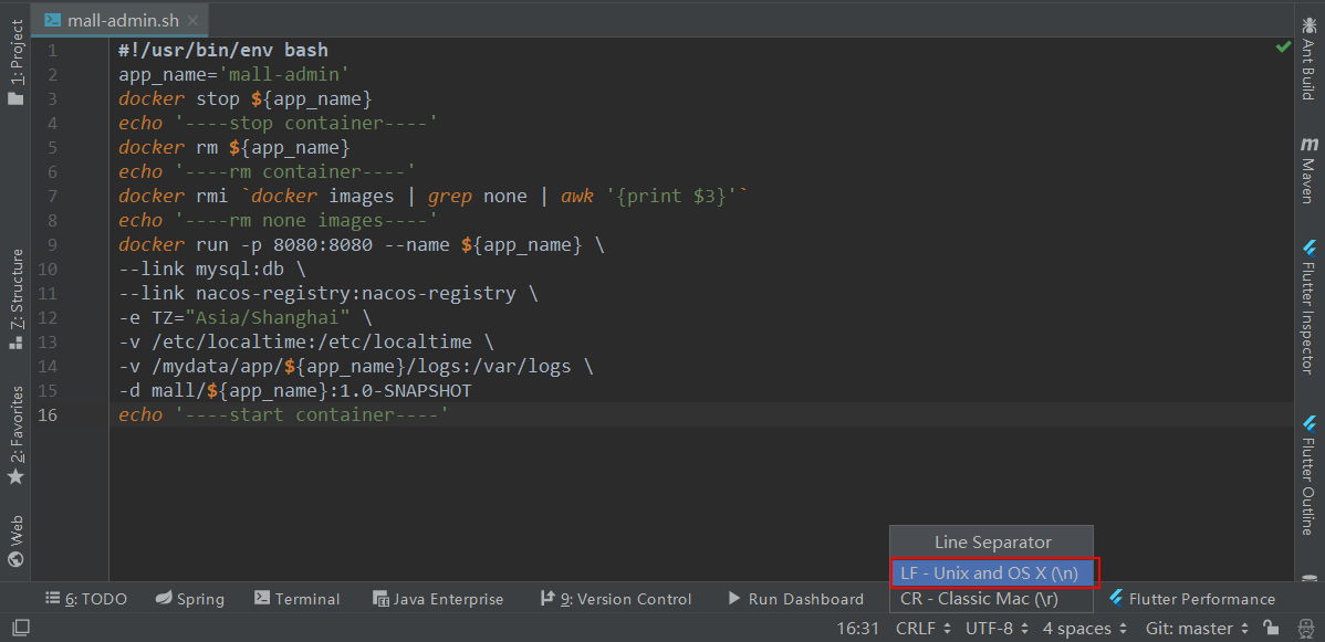 - 上传脚本前在IDEA中修改所有脚本文件的换行符格式为