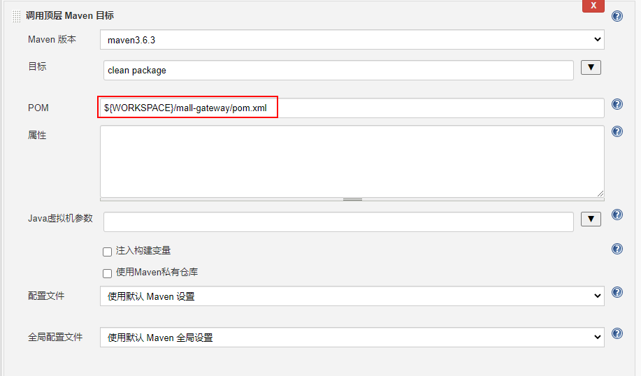 pom.xml文件位置,改为:${WORKSPACE}/mall-gateway/pom.xml