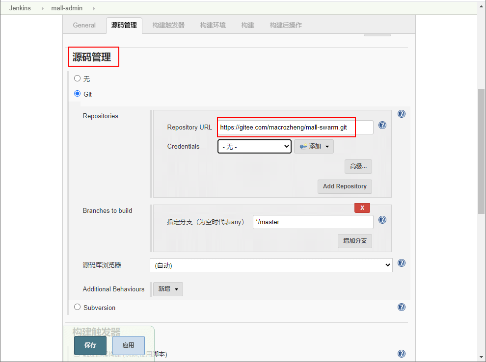 构建一个自由风格的软件项目,然后输入任务名称为mall-admin,配置其Git仓库地址,这里我直接使用了Gitee上面的地址: