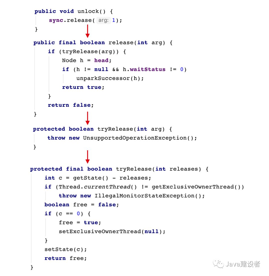unlock 和 lock 是一对情侣,它们分不开彼此,在调用 lock 后必须通过 unlock 进行解锁。如果当前线程持有锁,在调用 unlock 后,count 计数将减少。如果保持计数为0就会进行解锁。如果当前线程没有持有锁,在调用 unlock 会抛出 IllegalMonitorStateException 异常。下面是它的源码