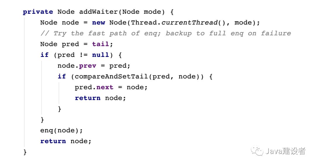 这里首先把当前线程和 Node 的节点类型进行封装,Node 节点的类型有两种,EXCLUSIVE和 SHARED ,前者为独占模式,后者为共享模式,具体的区别我们会在 AQS 源码讨论,这里读者只需要知道即可。