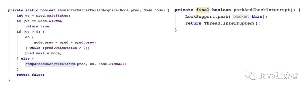 然后判断给定节点的先驱节点是不是头节点,并且当前节点能否获取独占式锁,如果是头节点并且成功获取独占锁后,队列头指针用指向当前节点,然后释放前驱节点。如果没有获取到独占锁,就会进入 shouldParkAfterFailedAcquire 和 parkAndCheckInterrupt 方法中,我们贴出这两个方法的源码