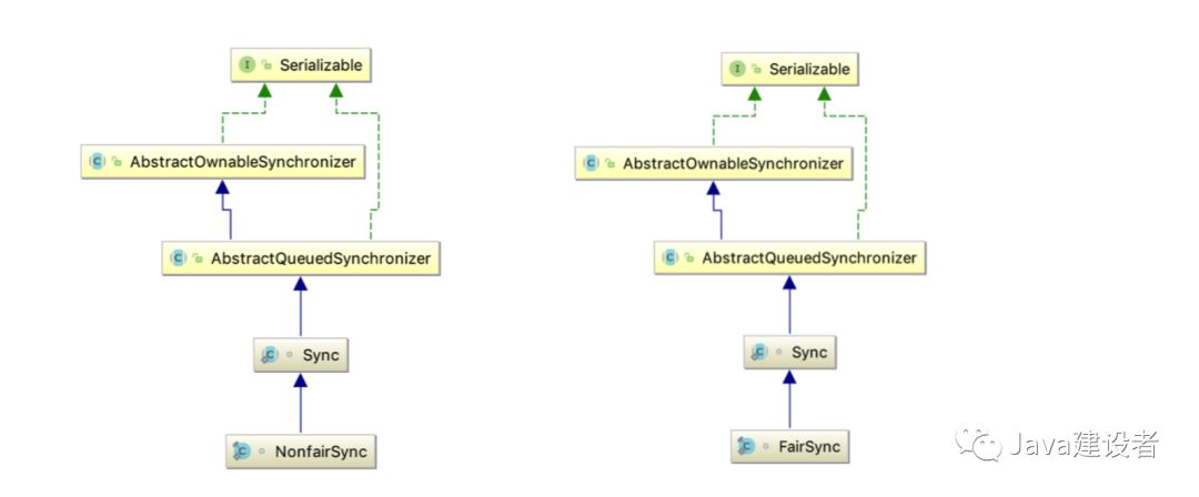 FairSync 和 NonfairSync 都是 ReentrantLock 的内部类,继承于 Sync 类,下面来看一下它们的继承结构,便于梳理。