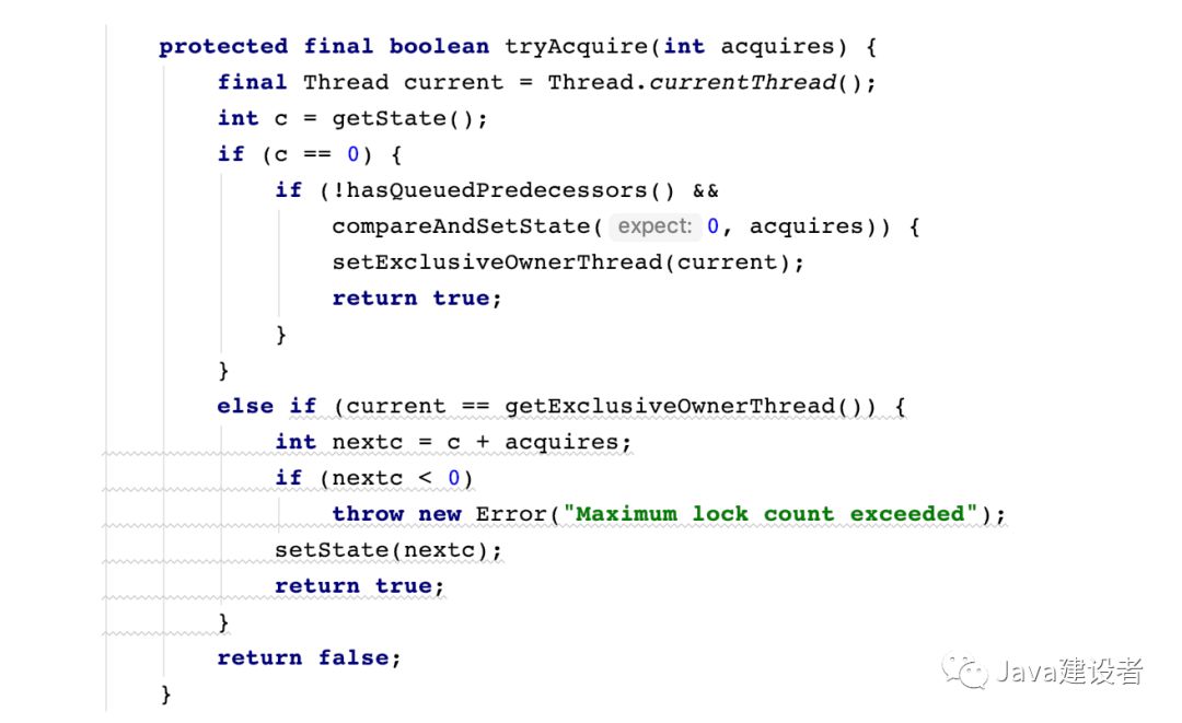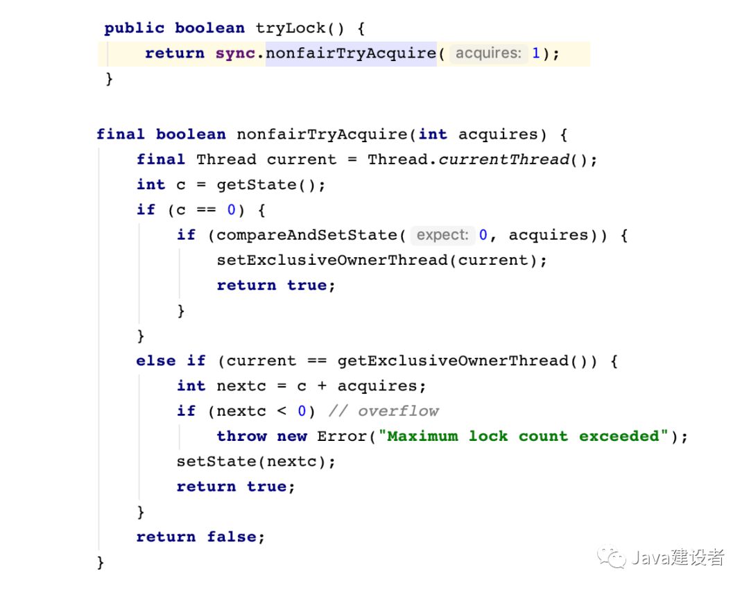 首先是第一条路线,tryAcquire 方法,顾名思义尝试获取,也就是说可以成功获取锁,也可以获取锁失败。