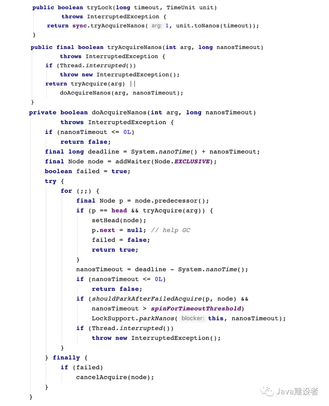 toNanos 用于把 long 型表示的时间转换成为纳秒,然后判断线程是否被打断,如果没有打断,则以公平锁/非公平锁 的方式获取锁,如果能够获取返回true,获取失败则调用doAcquireNanos方法使用超时等待的方式获取锁。在超时等待获取锁的过程中,如果等待时间大于应等待时间,或者应等待时间设置不合理的话,返回 false。