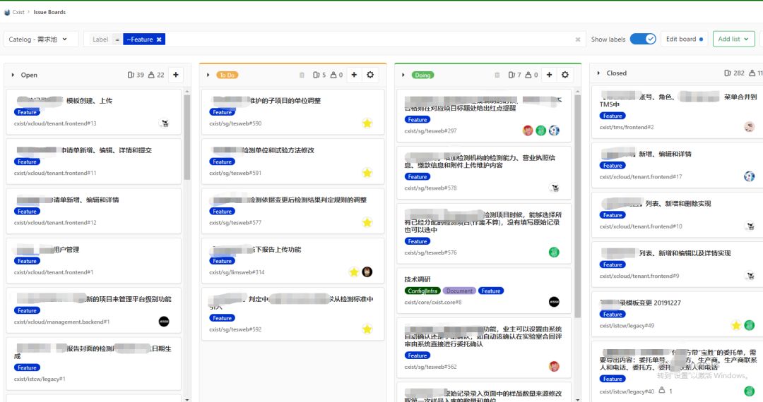 我之前用的是Teambition来做的可视化管理,现在的公司使用Gitlab Issue功能(它跟开发的代码评审结合的更紧密)所以我利用issue管理的功能和它的Board,Milesontes和 Labels功能结合起来就可以很好的对UserStory,Task和Bug来进行管理 。
